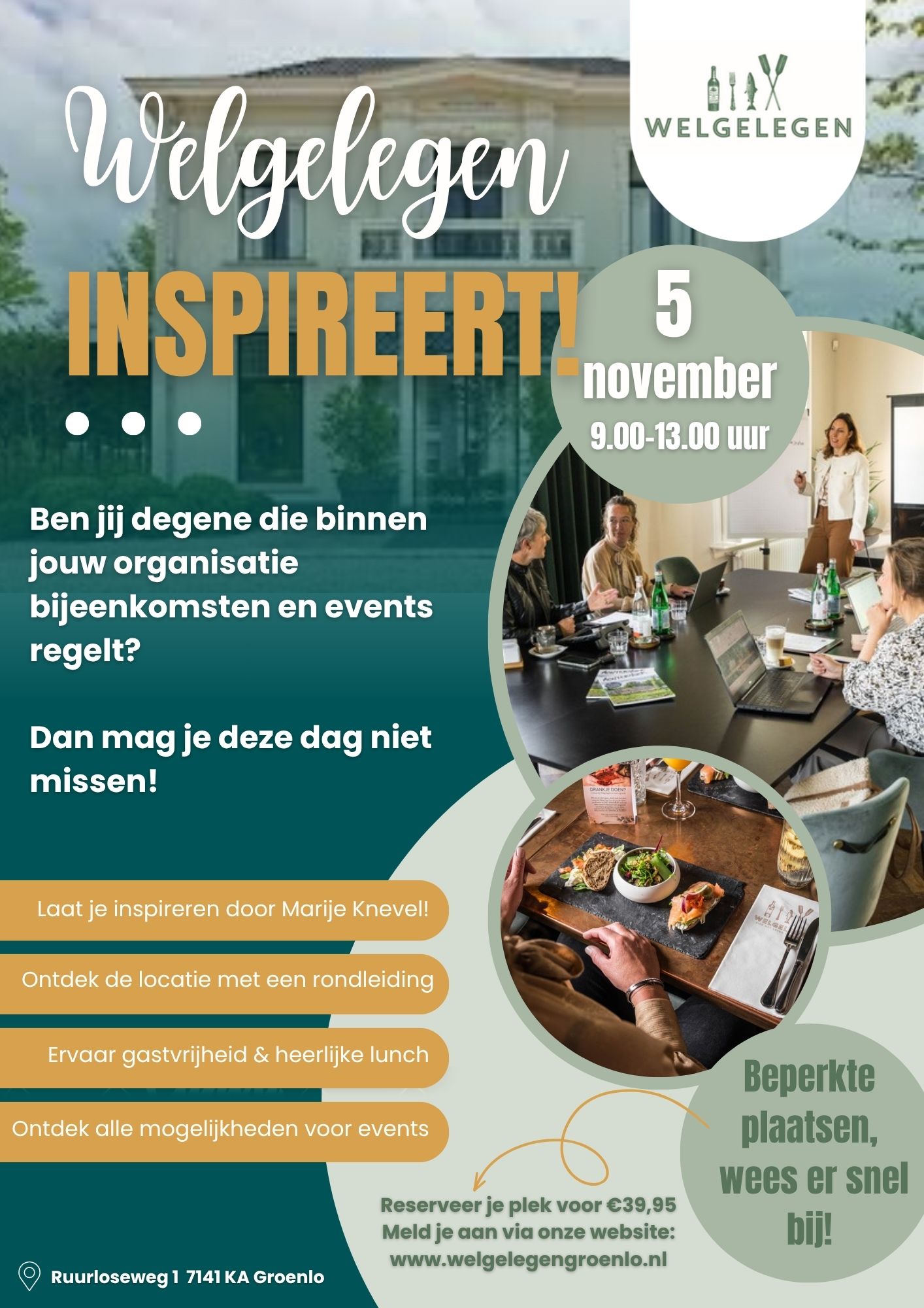 Wij nodigen jou van harte uit voor Welgelegen Inspireert! op 5 november 2025, een dag vol inspiratie voor iedereen die bijeenkomsten, vergaderingen, feesten, evenementen, lunches en diners organiseert.