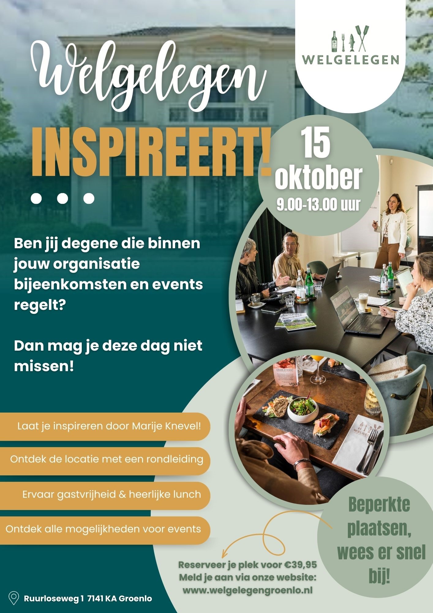 Wij nodigen jou van harte uit voor Welgelegen Inspireert! op 15 oktober 2025, een dag vol inspiratie voor iedereen die bijeenkomsten, vergaderingen, feesten, evenementen, lunches en diners organiseert.