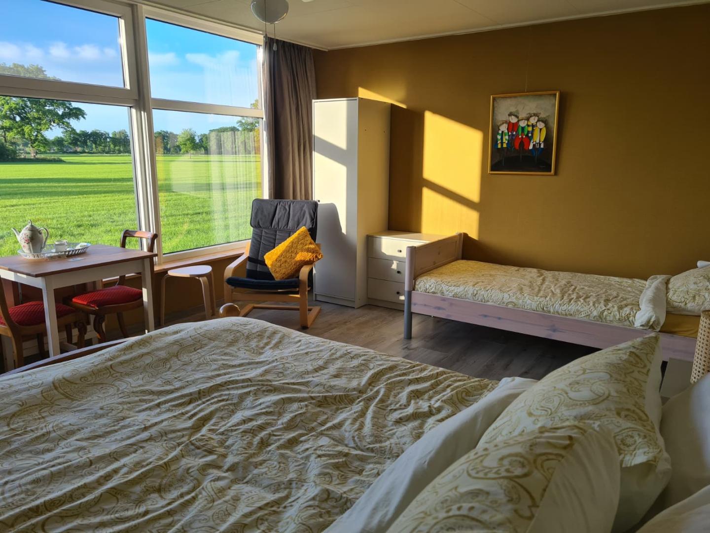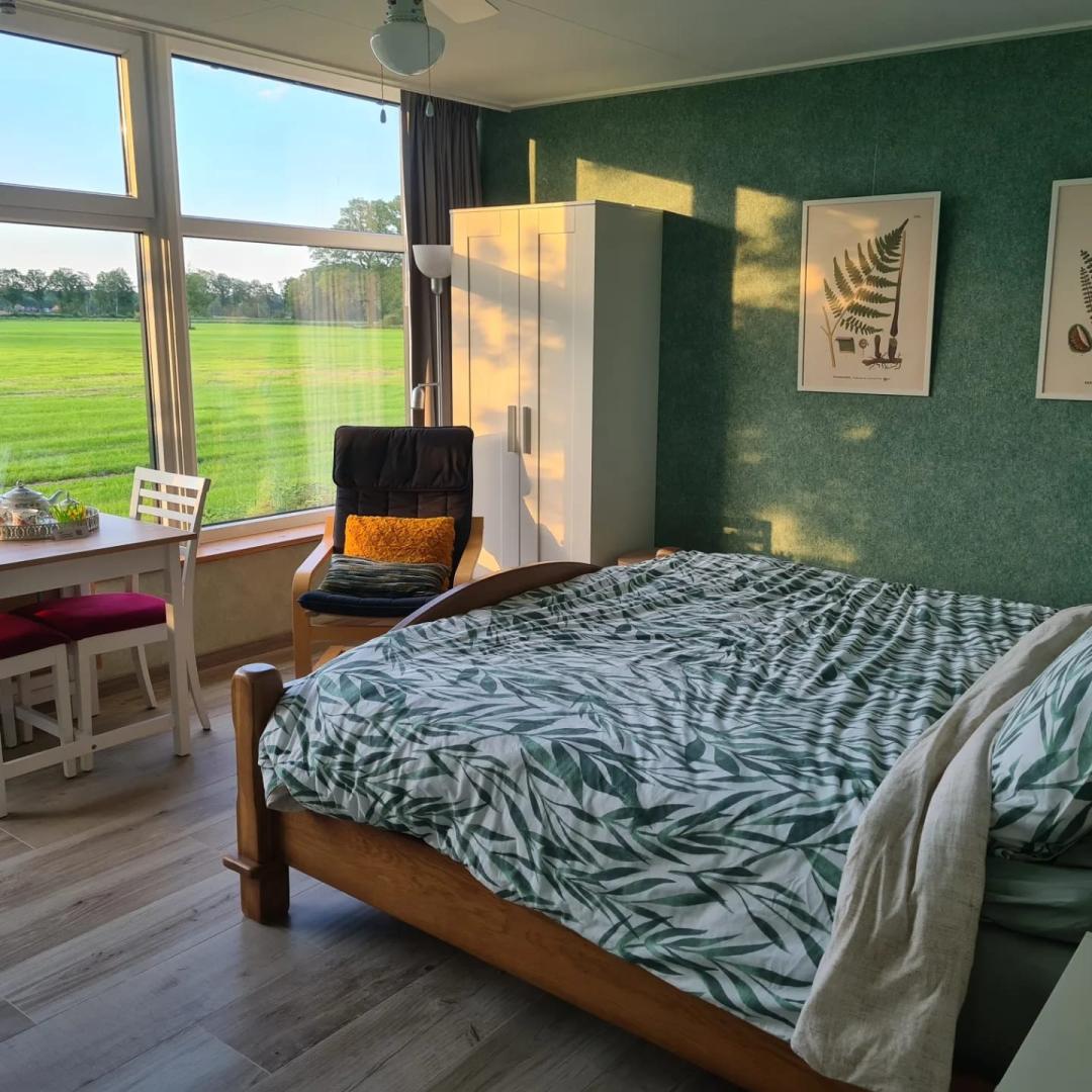Het uitzicht over de weilanden creëert direct een gevoel van rust en focus.