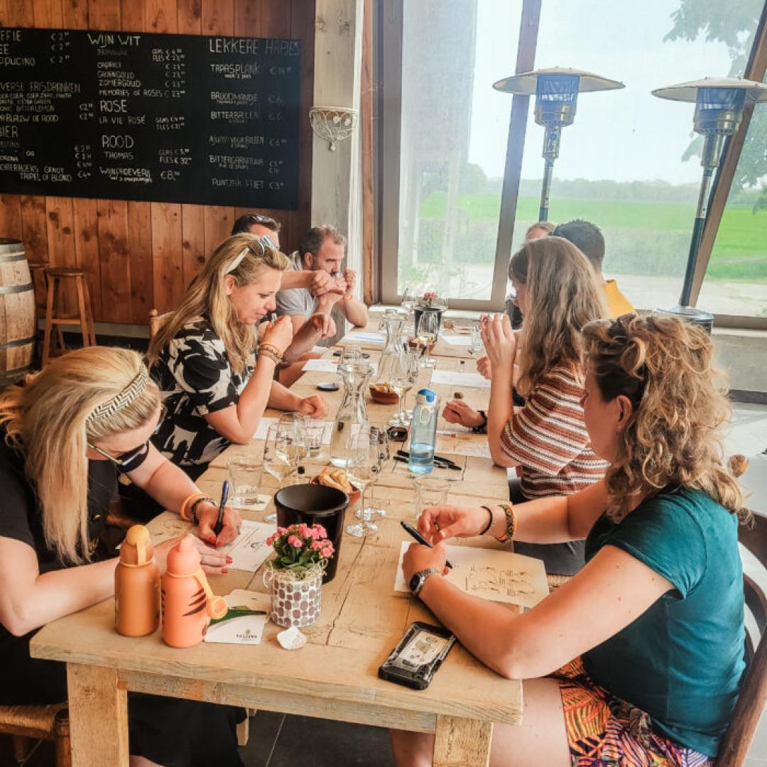 Na de rondleiding is het tijd om zelf de wijnen te analyseren en proeven! De wijnproeverij met onze Nederlandse wijnen vindt plaats in ons wijnhuis of met lekker weer op het terras. Iedereen krijgt een formulier om op te schrijven wat je ruikt, ziet en proeft.